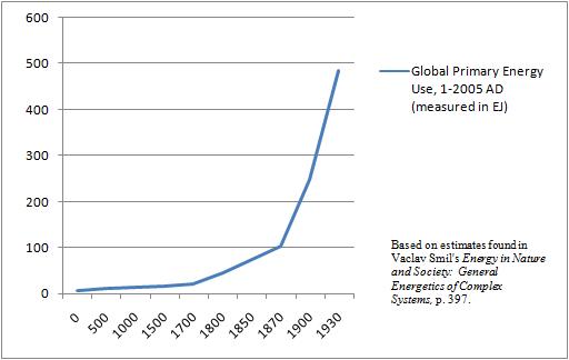 The term “static”, when applied to civilizations or resources, is a relative term. In using it I do not mean to imply that the complex societies of the old order experienced no change or growth. This is not the case. Territorial boundaries shifted this way and that; ancient peoples exhausted natural resources the world over, and economic growth changed the material culture of many a society. However, both the scale and the timing of these changes pale when compared to the changes of the exponential age. To pick an easy example – between the years 1000 and 1500 AD, the per capita GDP of Western Europe (which had the world’s highest economic growth rate) increased by $327 [Maddison 70]. In contrast, between the years of 2007 and 2008 the per capita GDP of the United States grew by $2,380.