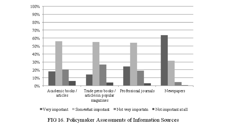 Figures 16 and 17 show that the most important sources of information for policymakers are classified information and newspapers. This makes sense in terms of the unique resources inside government and also the limited time policymakers have to read outside materials. It is striking, however, that policymakers find newspapers as useful as classified information, lending more credence to the widely recognized--if seldom acknowledged --fact that most policy is made based upon open sources. Conversely, and also not surprisingly, books (both scholarly and trade) and television and radio do not rank as highly as sources of we discuss this group's relationship. [2]Dr. Avey and Dr. Desch are interested in how decision makers assess different information sources because they are searching for ways that academics can get their results onto the desks of decision makers (their conclusion is academics who want the powers that be to listen to them need to be writing more op-eds for major newspapers). I am interested in the topic because understanding how American strategists know what they know about the world is critical to understanding why the American government does what it does in the world. [3]